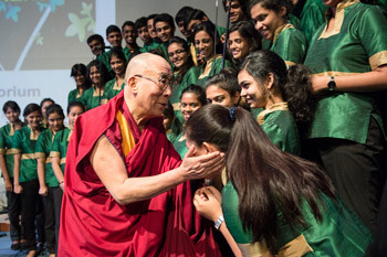 | Зураг. Дээрхийн гэгээн Далай лам Энэтхэгийн Бангалор хотын Христийн Их Сургуульд болсон "Даяаршин буй дэлхий ертөнцийн ёс зүйн хил хязгаарыг тогтоох нь" сэдэвт бага хурлын эхэнд дуулсан Христийн Их Сургуулийн найрал дууны хамтлагийн гишүүдтэй мэндчилж байгаа нь … 2014 оны 1 сарын 6 Зургийг: Тэнзин Чойжор |