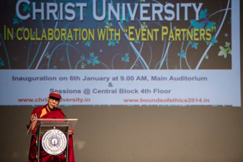 | Зураг. Дээрхийн гэгээн Далай лам Энэтхэгийн Бангалор хотын Христийн Их Сургуульд болсон "Даяаршин буй дэлхий ертөнцийн ёс зүйн хил хязгаарыг тогтоох нь" сэдэвт бага хурлын үеэр хүн төрөлхтний энэрэнгүй сэтгэл ба шашнаас ангид ёс зүйн ач холбогдлын тухай үг хэлж буй нь … 2014 оны 1 сарын 6 Зургийг: Тэнзин Чойжор |