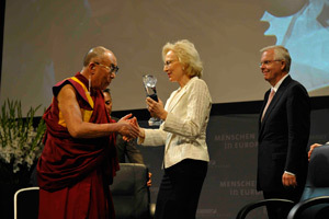 Хатагтай Анжелика Дикманн “Европ дахь хүн төрөлхтөн” хүндэт шагналыг Дээрхийн гэгээн Далай ламд өргөн барьж буй нь... Герман улс, Пассау хот. 2010 оны 9 дүгээр сарын 21. Зургийг dalailama.com. |