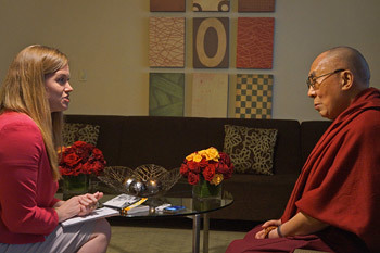 | Time сэтгүүлийн Элизабет Диас 2015 оны 7-р сарын 6-нд Калифорнийн Анахайм хотод Дээрхийн гэгээн Далай ламтай ярилцаж буй. Зургийг: Жереми Расселл / ДГДЛ-ын ажлын алба |