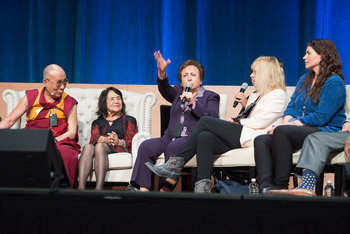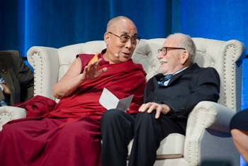 | 2015 оны 7-р сарын 6. Калифорни мужийн Ирвайн хот, Калифорнийн Их сургууль. Global Compassion дээд хэмжээний уулзалтын үеэр Дээрхийн гэгээн Далай лам далай судлаач Вальтер Мункийн хамт үг хэлж буй нь. Зургийг: Тэнзин Чойжор / Дээрхийн гэгээний Далай ламын ажлын алба |