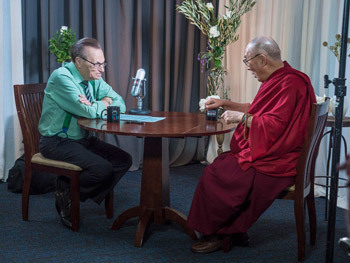 | Ларри Кинг 2015 оны 7-р сарын 6-нд Калифорнийн Ирвин хотод Дээрхийн гэгээн Далай ламтай ярилцаж буй. Зургийг: Тэнзин Чойжор/Дээрхийн гэгээн Далай ламын ажлын алба |