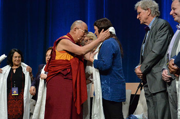 | 2015 оны 7-р сарын 6. Калифорни мужийн Ирвайн хот, Калифорнийн Их сургууль. Global Compassion дээд хэмжээний уулзалтын үдээс хойших хуралдааны хэлэлцүүлэгт оролцогч бүрт Дээрхийн гэгээн Далай лам цагаан хадаг гардуулж байна. Зургийг: Сонам Зоксанг |