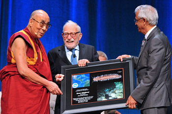 | 2015 оны 7-р сарын 6. Калифорни мужийн Ирвайн хот, Калифорнийн Их сургууль. Уур амьсгалын өөрчлөлтийн талаарх хэлэлцүүлгийн төгсгөлд доктор Раманатан болон доктор Мунк нар шинээр нээн илрүүлж, 'Sirsoe dalailamai' хэмээн нэрлэгдсэн далайн төрөл зүйлийн гэрэл зургийг Дээрхийн гэгээн Далай ламд гардуулж байна. Зургийг: Сонам Зоксанг |