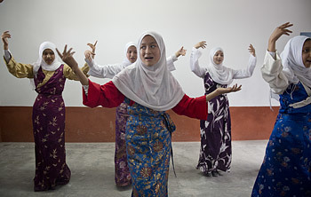 Дээрхийн эгээн вдийн мусульман иргэдтэй уулзах үеэр толилуулах бүжгийг бэлтгэн давтаж буй төвд мусульман охид. Зургийг Тэнзин Чойжор OHHDL |