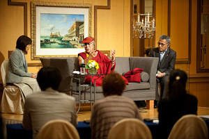 | His Holiness the Dalai Lama with his Japanese and English interpreters during his talk in Yokahama on June 24th, 2010. Photo/Tenzin Choejor/OHHDL |
