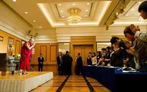 | His Holiness the Dalai Lama greets students and educationists before an interactive talk in Yokohama on June 24th, 2010. Photo/Tenzin Choejor/OHHDL |