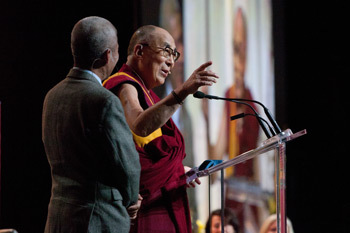 Зураг. Дээрхийн гэгээн Далай лам Ванкувер төвд болсон “Зүрх сэтгэлийн боловсролын шинжлэх ухаан” сэдэвт хэлэлцүүлэгт илтгэл тавьж байгаа нь ... Канад, Ванкувер, 2014 оны 10 сарын 21 Зургийг: Далай лам төв |
