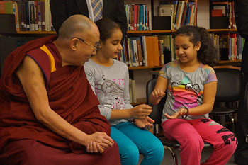 | Зураг. Жон Оливерын сургуульд хийсэн айлчлалын үеэр Дээрхийн гэгээн Далай лам сурагчидтай талархлын тухай ярилцаж байгаа нь ... Канад, Ванкувер, 2014 оны 10 сарын 21 Зургийг: Жереми Руссел |