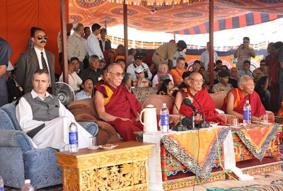 | “Нубра хөндийн Дискит хийдэд сүндэрлэсэн шинэ Майтрейя Бурхан багшийн хөшөөний нээлтийн ёслолын үеэр Дээрхийн гэгээн Далай лам Гадэн Трипа Ризонг Ринбүүчи, Тиксэй Ринбүүчи болон Жамму, Кашмир мужийн Ерөнхий сайд Омар Абдуллагийн хамт сууж буй нь.” |