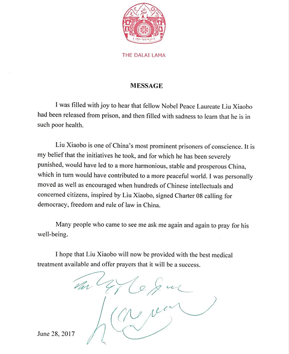 Нобелийн энх тайвны шагналыг надтай нэгэн адил хүртсэн Лю Сяобо шоронгоос суллагдсаныг сонсоод би бээр маш их баярласан боловч түүний биеийн байдал тааруу байгааг мэдээд ихэд гунигтай байна.