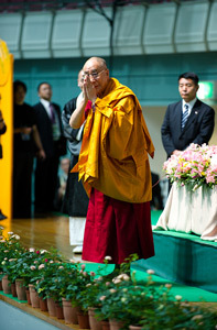 | HIs Holiness the Dalai Lama greets the audience before the teaching in Nagano, Japan. Photo/Tenzin Choejor/OHHDL |