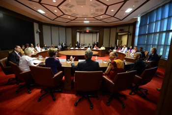 | Зураг. Дээрхийн гэгээн Далай лам ерөнхийлөгч асан Жорж В.Бушийн нэрэмжит хүрээлэнд болсон “Эрх чөлөө, манлайллын форум”-д оролцож байгаа Мяьнмарын оюутнуудтай уулзаж буй нь… АНУ, Техас муж, Даллас хот. 2015 оны 7 дугаар сарын 1. Зургийг Ерөнхийлөгчийн нэрэмжит хүрээлэн. |