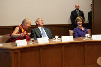 Ерөнхийлөгч Буш, “Баярлалаа. Мөн энд хүрэлцэн ирсэн та бүхэнд талархлаа. Заримдаа улс төрийн хүрээлэлд хүмүүс тантай уулзаад, ямар нэгэн зүйл ярилцдаг ч тэр нь чин сэтгэлээсээ биш байх тохиолдол олон гардаг. Харин Дээрхийн гэгээн бол таны нүд рүү эгцлэн хараад, хэлсэн үг бүрдээ чин сэтгэлээ шингээдэг тийм л хүн. Хятад улс түүнд олон саад бэрхшээлийг учруулдаг ч тэрбээр үргэлжид баяр баясгалантай байдаг юм. Учир нь түүний зүрх энэрэл хайраар мөнхийн дүүрэн байдаг, ариун сайхан сэтгэлт хүн билээ. Би бол Дээрхийн гэгээний хамт олон нийтийн өмнө ил гарч зогссон АНУ-ын цорын ганц ерөнхийлөгч. Далай лам хүн бүрийг эрх чөлөөтэй байх ёстой хэмээсэн итгэл үнэмшлийг нь үгүйсгэхийг оролддог олон хүчинтэй нүүр тулан тэмцэж байна. Түүнийг энд байгаад би чин сэтгэлээсээ баяртай байна” хэмээхэд Дээрхийн гэгээн “Хүндэт анд нөхөд минь, ноён, хатагтай Буш. Төвөдийн зүүн хойд нутгаас гаралтай миний хувьд дэлхийн нөгөө талд амьдардаг та бүхэнтэй ийнхүү дахин уулзаж байгаа нь үнэхээр сэтгэл догдлом сайхан байна. Би бээр буддын шашинт оронд, та бүхэн христийн уламжлалт оронд өсөж хүмүүжсэн ч хүн төрөлхтний хувьд бид адилхан. Энэ бол маш чухал санаа. Учир нь энэ цагийн ихэнх зөрчил тэмцэл шашин шүтлэг, арьс өнгө зэрэг хоёрдогч ялгаанаас үүдэлтэй байдаг. Гэтэл угтаа бид бүгд л адилхан. Сэтгэл зүй, бие махбод, сэтгэл хөдлөлийн хувьд ямар ч ялгаагүй. Бид адилхан төрж, адилхан нас бардаг. Жаргалтай амьдрахыг хүсэх нь бид бүгдийн нийтлэг мөн чанар юм. Хэрэв бид хүн төрөлхтний нэгдмэл энэ мөн чанарыг илүү ухамсарлаж чадвал зөрчилдөх, хүчирхийлэх, бусдыг зовоох ямар ч шалтгаан үлдэхгүй болно.