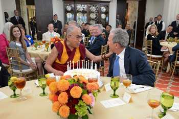 | Зураг. 2015 оны 7 дугаар сарын 1-ний өдөр АНУ-ын Техас мужийн Даллас хотын Жорж В.Бушийн Ерөнхийлөгчийн төвд болсон үдийн зоогийн үеэр ерөнхийлөгч асан Буш Дээрхийн гэгээний 80 насны ойг угтан бялуу бэлэглэхэд Далай лам ихэд баярлаж буй нь... Зургийг Bush Center. |