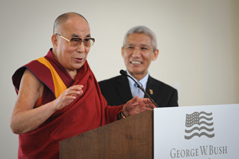 | Зураг. Дээрхийн гэгээн Далай лам орчуулагч Түвдэн Жимпагийн хамт АНУ-ын Техас мужийн Даллас хотын Жорж В.Бушийн Ерөнхийлөгчийн төвд илтгэж буй нь... 2015 оны 7 дугаар сарын 1. Зургийг Bush Center. |