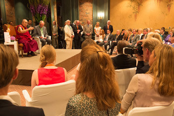 | Дээрхийн гэгээн Далай лам 2015 оны 7 дугаар сарын 12-ны өдөр Холбооны Бүгд Найрамдах Герман Улсын Хессен мужийн Висбаден хотод хэвлэл мэдээллийн төлөөлөгчидтэй уулзаж буй. .Зургийг: Мануэль Бауэр |