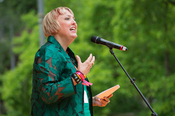 | Ногоон намын гишүүн Клаудиа Рот 2015 оны 7 дугаар сарын 12-ны өдөр ХБНГУ-ын Хессен мужийн Висбаден хотын Курпарк цэцэрлэгт хүрээлэнд Дээрхийн гэгээн Далай ламын айлдварын өмнө үг хэлж буй нь. Зургийг: Мануэль Бауэр |