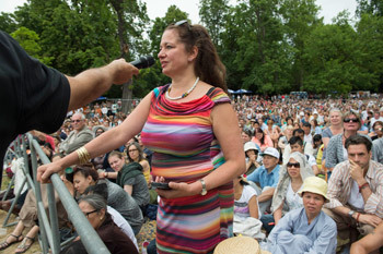 | Дээрхийн гэгээн Далай ламыг 2015 оны 7 дугаар сарын 12-ны өдөр ХБНГУ-ын Хессен мужийн Висбаден хотын Курпарк цэцэрлэгт хүрээлэнд айлдвар айлдаж байх үед үзэгчдийн нэг төлөөлөл асуулт асууж буй нь. Зургийг: Мануэль Бауэр. |