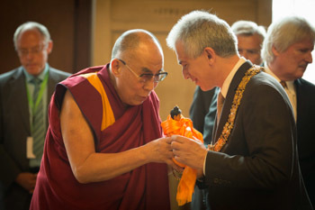 | Дээрхийн гэгээн Далай лам болон хотын дарга Петер Фельдман нар 2015 оны 7 дугаар сарын 13-ны өдөр ХБНГУ-ын Франкфурт хотын захиргаанд хүлээн авалтад хүрэлцэн ирж буй нь. Зургийг: Мануэль Бауэр. |