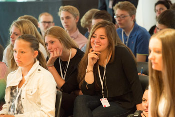 | 2015 оны 7 дугаар сарын 13-ны өдөр ХБНГУ-ын Франкфурт хотын Applied Art урлагийн музейд Дээрхийн гэгээн Далай ламыг асуултад хариулах үеэр сурагчид анхааралтай сонсож буй нь. Зургийг: Мануэль Бауэр. |