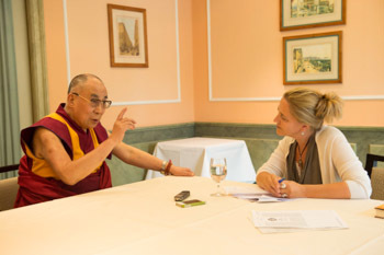 | 2015 оны 7 дугаар сарын 13-ны өдөр ХБНГУ-ын Франкфурт хотод "Süddeutsche Zeitung" сонины тойм редактор Карин Штайнбергер ярилцлага авах үеэр Дээрхийн гэгээн Далай лам түүний асуултад хариулж буй нь. Зургийг: Мануэль Бауэр. |