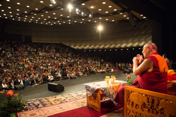 | 2015 оны 7 дугаар сарын 13-ны өдөр ХБНГУ-ын Франкфурт хотын Jahrhunderthalle ордонд болсон 80 насны ойн баяр дээр Дээрхийн гэгээн Далай лам үг хэлж буй нь. Зургийг: Мануэль Бауэр. |