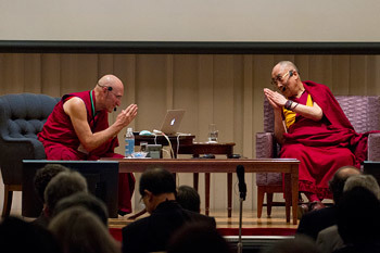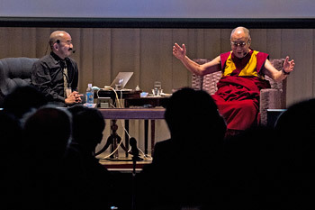 | Зураг. Калифорнийн технологийн хүрээлэнгийн туршилтын сэтгэл судлалын профессор Шинсүкэ Шиможогийн илтгэлийн үеэр Дээрхийн гэгээн Далай лам санал сэтгэгдлээ хэлж байгаа нь … Япон, Киото, 2014 оны 4 сарын 12 Зургийг: Япон дахь Төвөдийн ажлын алба |