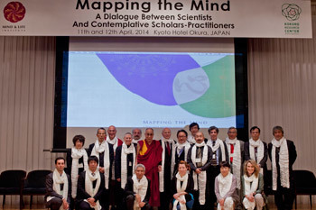 | Зураг. “Оюун санааг зураглах нь” хурлын 2 дахь өдөр, Дээрхийн гэгээн Далай лам Доктор Барри Керзинийн илтгэлд талархал илэрхийлж байгаа нь … Япон, Киото, 2014 оны 4 сарын 12 Зургийг: Япон дахь Төвөдийн ажлын алба |