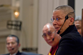| Зураг. “Оюун санааг зураглах нь” хурлын 2 дахь өдөр, илтгэлийн үеэр Зэн Роши Жоан Халифакс үг хэлж байгаа нь... Япон, Киото, 2014 оны 4 сарын 12 Зургийг: Япон дахь Төвөдийн ажлын алба |