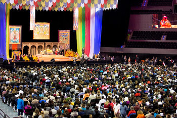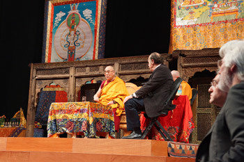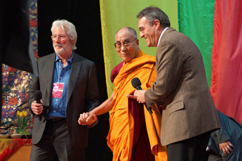 Дээрхийн гэгээнийг машинаасаа буухад түүний хуучны анд, жүжигчин Ричард Гир угтан авч, тайзны арын хэсэг рүү хамт алхав. Дараа нь Гир тайзан дээр түрүүлэн гарч, хүрэлцэн ирсэн 4000 гаруй хүнд Дээрхийн гэгээнийг танилцуулан, тайзнаа урилаа. Дээрхийн гэгээн тайзнаа заларч, хурсан олонтой алга хавсран мэндчилэхэд бүгд түүнийг халуун дотноор хүлээн авлаа. Шүтээн зургаар чимэглэсэн тайзнаа энгийн түшлэгтэй сандалд суугаад, яриагаа эхлүүлэв.
