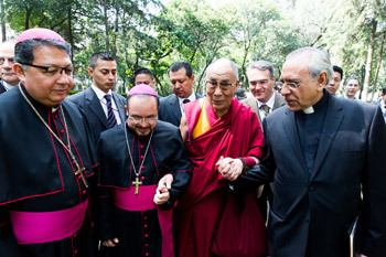 Дээрхийн гэгээн Далай ламыг Мексикийн Понтифик Их Сургуульд (Universidad Pontificia de México) хүрэлцэн ирэхэд нь Мексикийн хамба нарын зөвлөлийн нарийн бичгийн дарга, хамба лам Эугенио Лира Ругарсиа, тус сургуулийн захирал Марио Анхель Флорес Рамос, Мехико хотын туслах хамба Марио Криспин Охеда Маркес нар угтан авч, мэндчилэв. 2013 оны 10 дугаар сарын 12. Мексик улс, Мехико хот. Гэрэл зургийг Оскар Фернандес. |